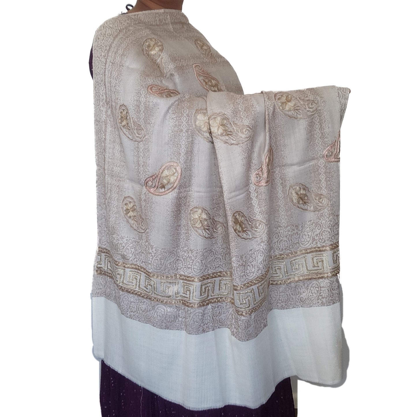 PURE WOOL PASHMINA SHAWL CREAM COLOR WITH THREAD WORK WITH IN AND BORDER